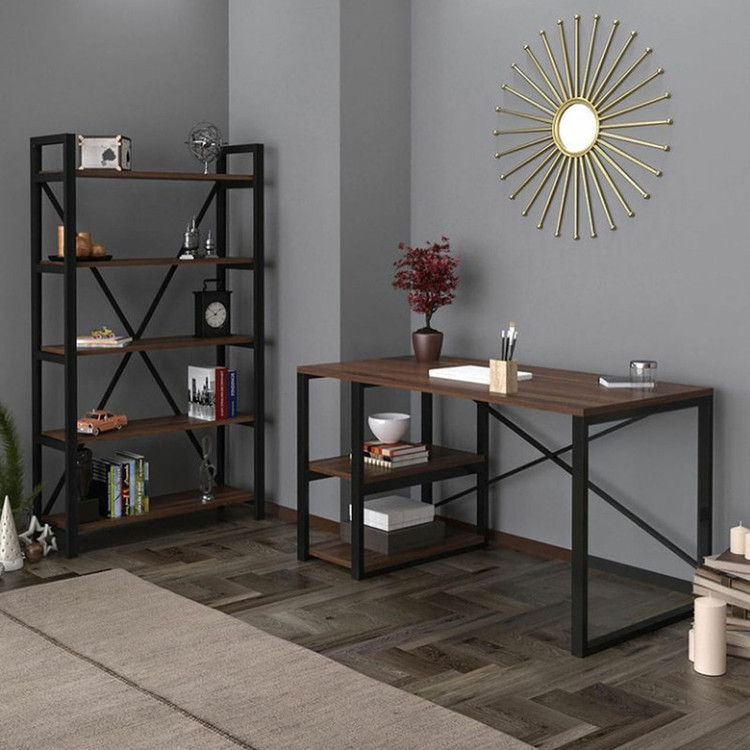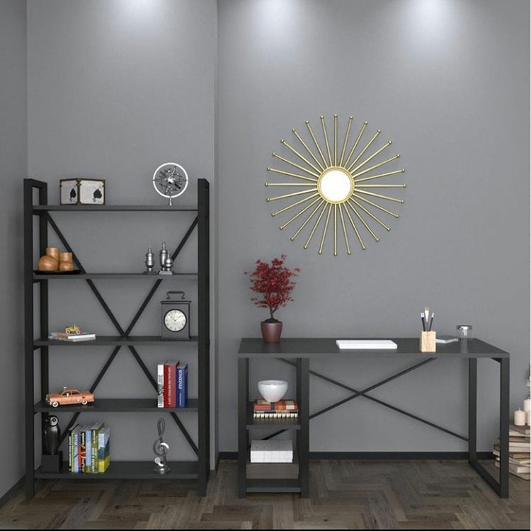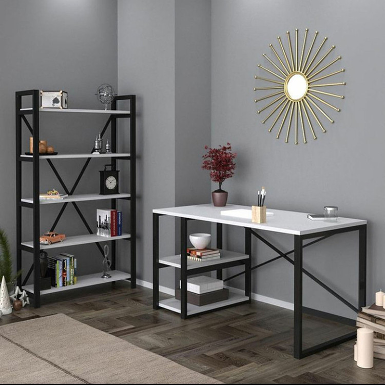 تنوع رنگی مربوط به روکش صفحات است. رنگ فریم فلزی هردوکار ثابت مشکی است.(الکترواستاتیک کوره ای) جنس صفحات MDF روکشدار است. جای کیس میز کامپیوتر سمت راست آن است. ابعاد میز کامپیوتر 120x60 ابعاد کتابخانه 90x30 با ارتفاع 160 سانتی متر