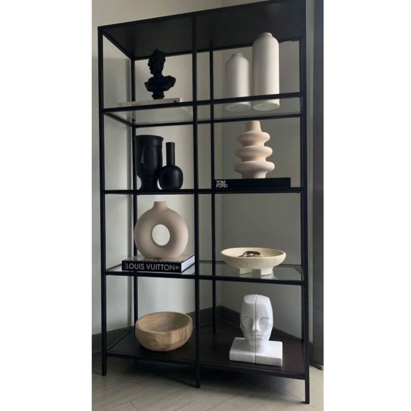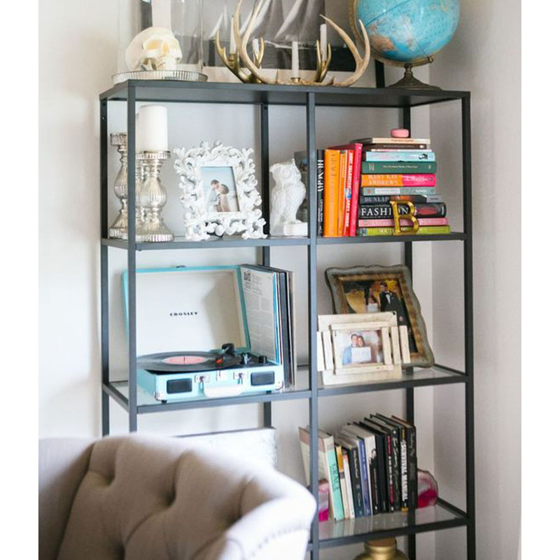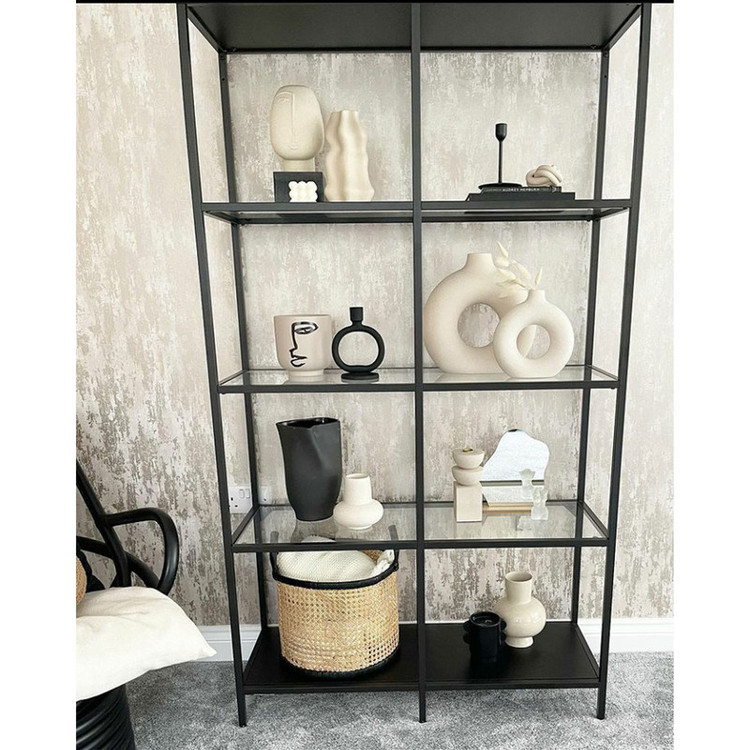 جنس صفحات بلایی و پایینیMDF روکشدار مشکی است و جنس 3صفحه میانی شیشه ساده و شفاف است.