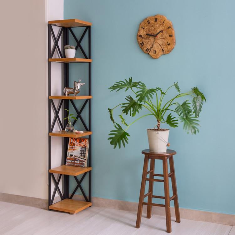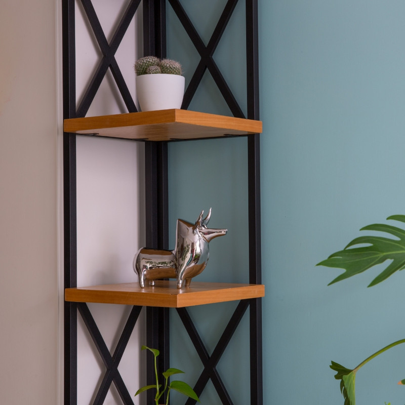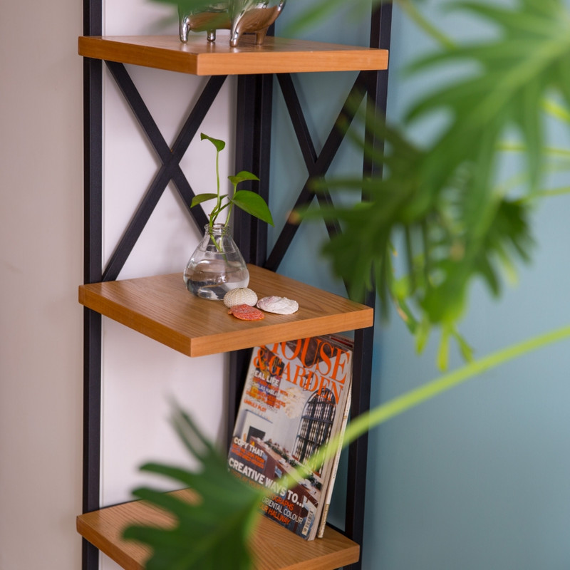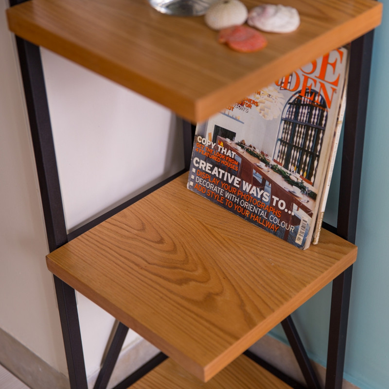استند کتابخانه با بدنه فلزی دارای رنگ کورهای صفحات بار روکش چوب بلوط