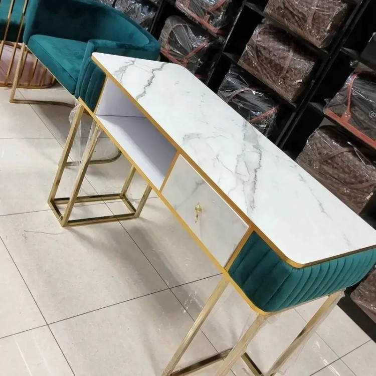 میز ناخن تک نفره پایه فلزی فورتیک دررنگ بندی طلایی وکروم و بغل پارچه خم وصاف رویه طرح سنگ مشکی وسفید