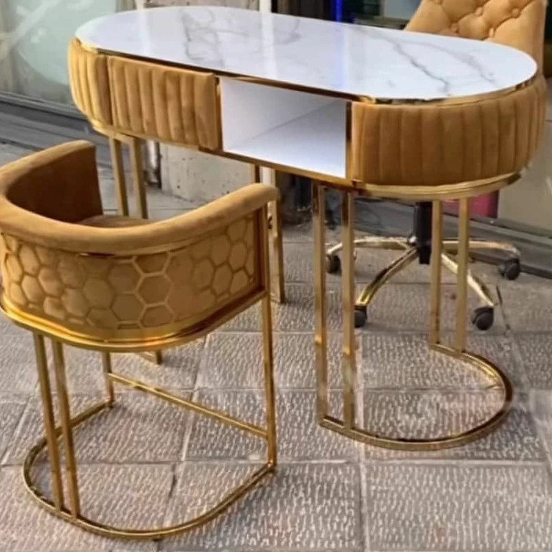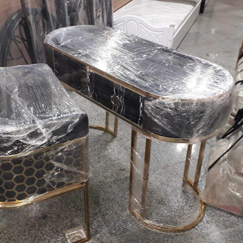 میز ناخن تک نفره پایه فلزی فورتیک دررنگ بندی طلایی وکروم و بغل پارچه خم وصاف رویه طرح سنگ مشکی وسفید