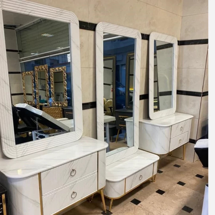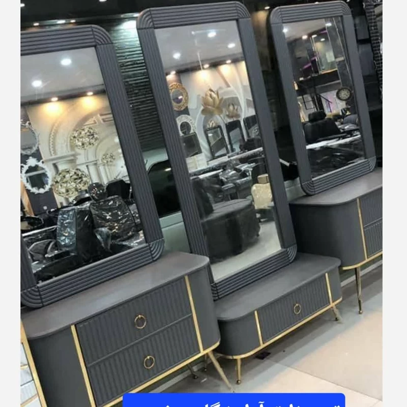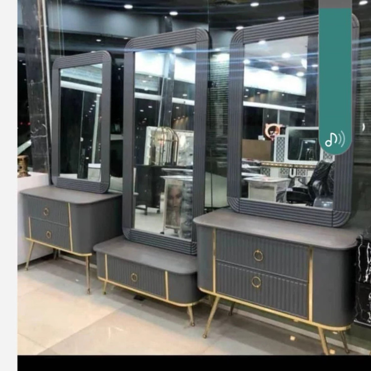 دکور آرایشگاهی سه تیکه فلکسی بغل خم دررنگ بندی چوب سفید طوسی مشکی کرم دارای سه تادکور وسه تا آینه ابعاد آینه بزرگه 80در160 کوچک 80در120 پایع فلزی طلایی