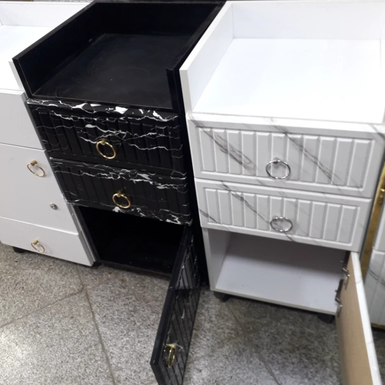 ترولی چوبی دارای دوکشو ریلی ویک در کمد دار دررنگ بندی سفید ومشکی چرخدار میباشد