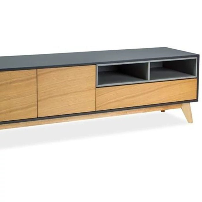 میز تلویزیون مدل e02b با طراحی شیک و منحصر به فرد خود زیبایی را به خانههای گرمتان هدیه میکند. شکل ساده و مستطیل این میز، علاوه بر اینکه با تلویزیونهای تخت هماهنگ است، باعث میشود تا با هر نوع دکوراسیون هارمونی مناسبی داشته باشد. ابعاد میز تلویزیون به اندازه 180 در 35سانتیمتر میباشد. بهعلاوه، ارتفاع 53 سانتیمتری آنکه هماهنگ باحالت نشسته است، لذت تماشای تلویزیون را به شما داده و باعث میشود که در حین تماشای برنامه دلخواه خود، نیازی به تغییر جا و یا ارتفاعتان نداشته باشید.این میز مجهز به یک کشو کاربردی بوده و دو عدد درب که جای لازم برای وسایل دلخواه کاربران را فراهم کرده است. همچنین برای استقرار دیگر لوازم صوتی و تصویری، مانند سینمای خانگی، کنسولهای بازی، انواع گیرندهها و پخشکنندهها، یک طبقهی مجزا در قسمت سمت راست میز در نظر گرفته شده است.این میز تلویزیون به شکل مونتاژ شده در بسته بندی ارسال خواهد شد و شما نیازی به هیچگونه نصب لوازم و قطعات آن ندارید.جنس این محصول ام دی اف می باشد