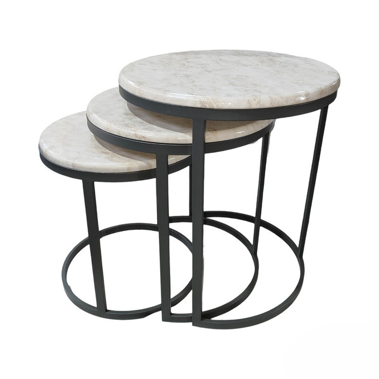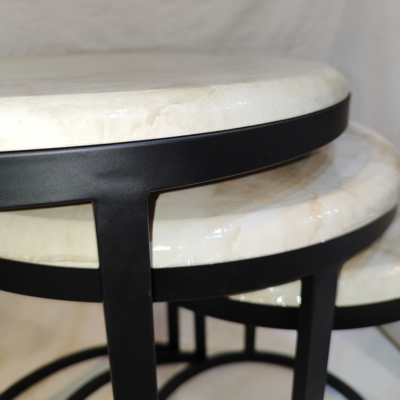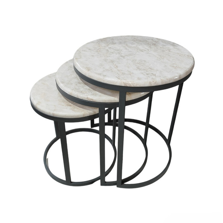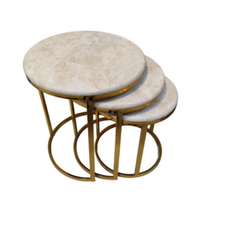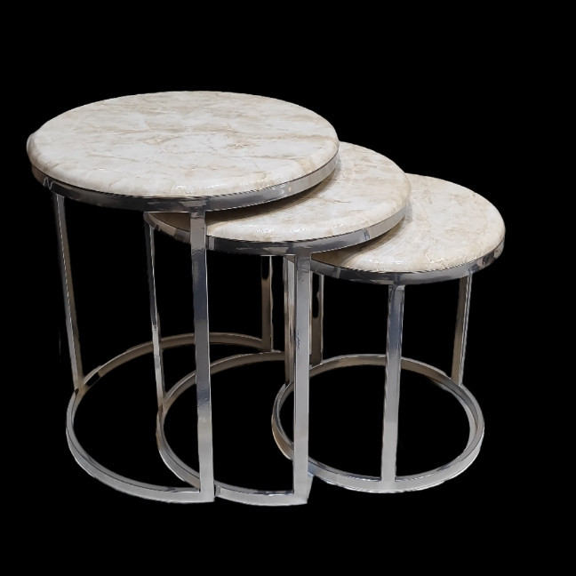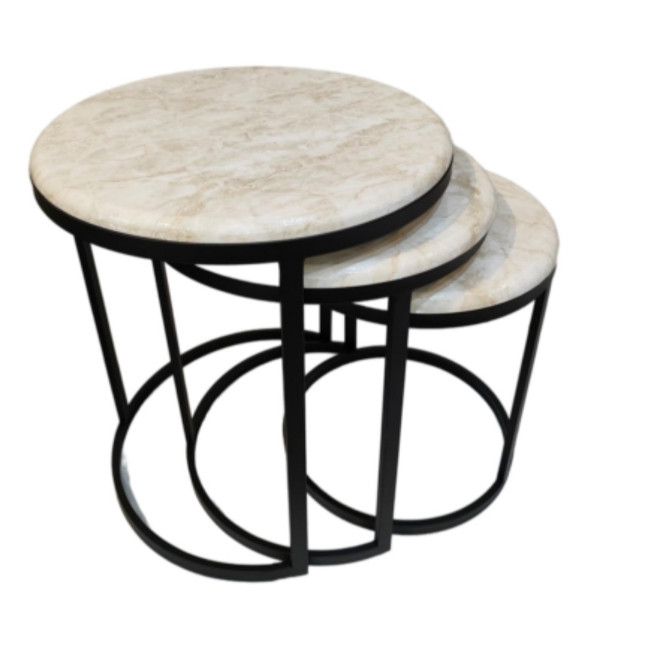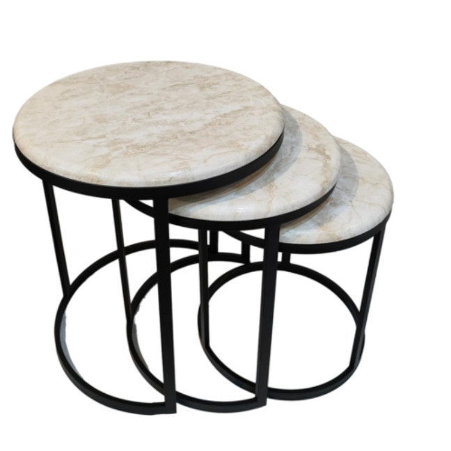 میز جلومبلی سه عددی که به راحتی در زیر یکدیگر قرار میگیرند و فضای کمی اشغال میکند. پایه میز آبکاری شده و طلایی است. همچنین جنس صفحه ام دی اف طرح دار با روکش وکیوم میباشد. ابعاد میز کوچک دایره 35 و ارتفاع 38 میباشد. ابعاد میز متوسط دایره 40 و ارتفاع 44 میباشد. ابعاد میز بزرگ دایره 45 و ارتفاع 50 میباشد.