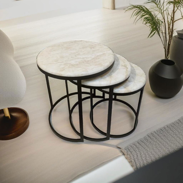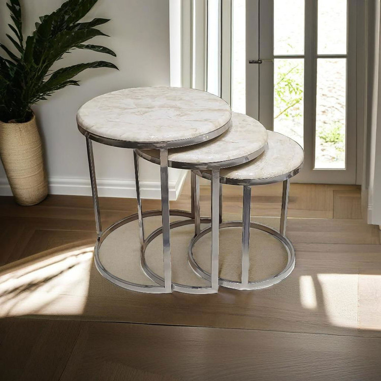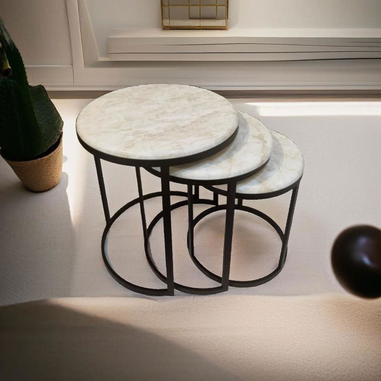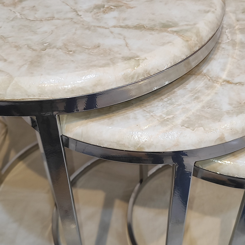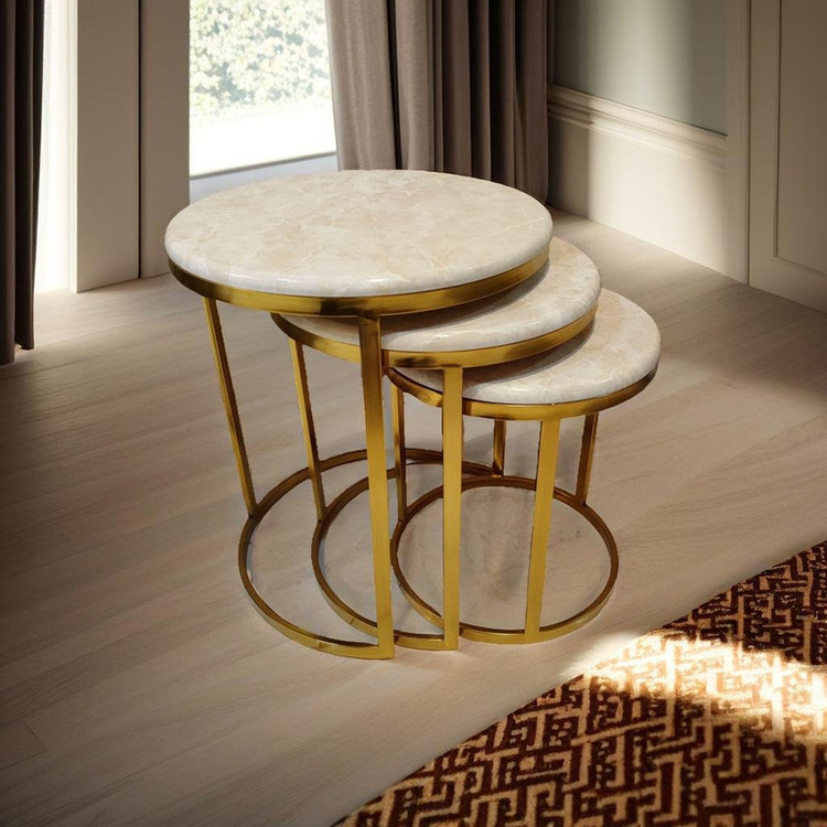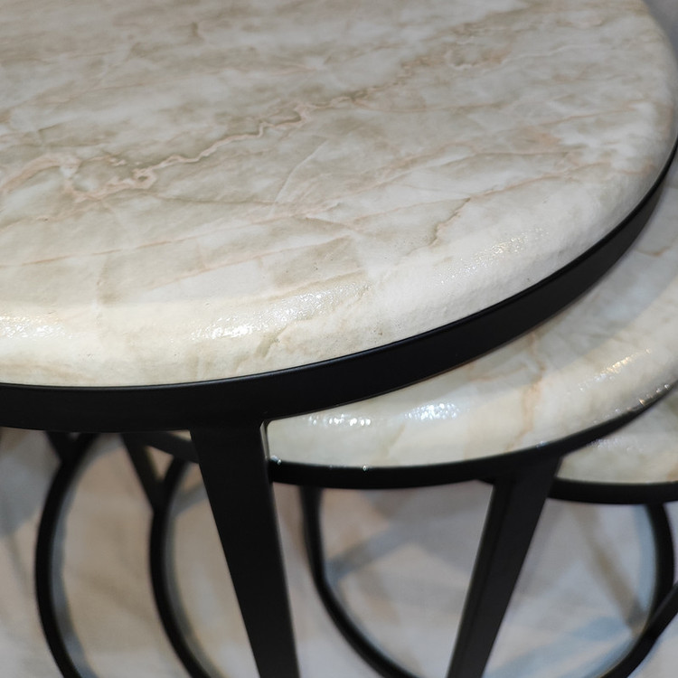 میز جلومبلی سه عددی که به راحتی در زیر یکدیگر قرار میگیرند و فضای کمی اشغال میکند. پایه میز آبکاری شده و طلایی است. همچنین جنس صفحه ام دی اف طرح دار با روکش وکیوم میباشد. ابعاد میز کوچک دایره 35 و ارتفاع 38 میباشد. ابعاد میز متوسط دایره 40 و ارتفاع 44 میباشد. ابعاد میز بزرگ دایره 45 و ارتفاع 50 میباشد.