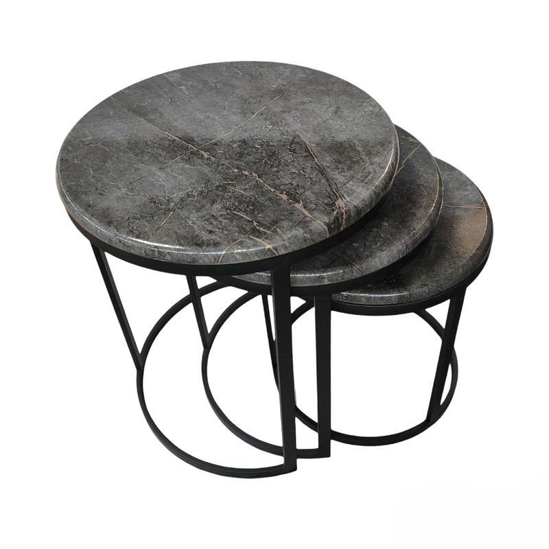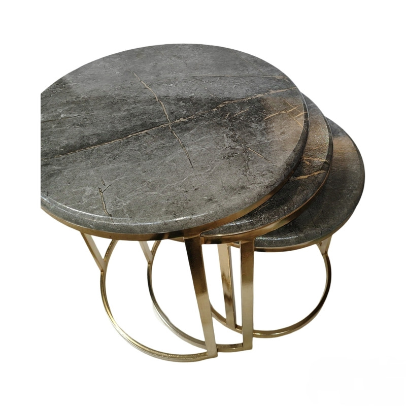 میز جلومبلی سه عددی که به راحتی در زیر یکدیگر قرار میگیرند و فضای کمی اشغال میکنند. پایه از جنس آهن آبکاری شده و براق است. همچنین جنس صفحه ام دی اف با روکش وکیوم میباشد. ابعاد میز کوچک دایره 35 و ارتفاع 38 میباشد. ابعاد میز متوسط دایره 40 و ارتفاع 44 میباشد. ابعاد میز بزرگ دایره 45 و ارتفاع 50 میباشد.