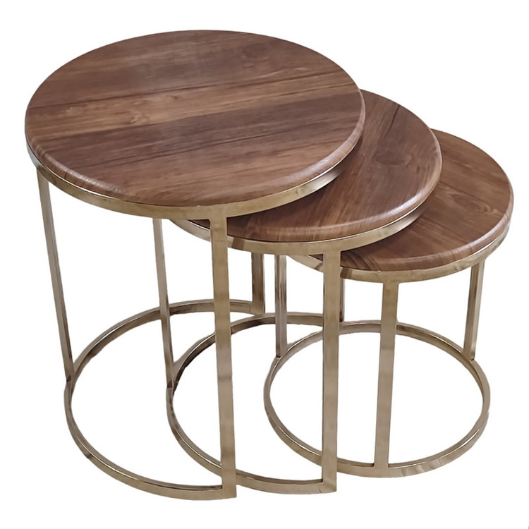 میز جلومبلی سه عددی که به راحتی در زیر یکدیگر قرار میگیرند و فضای کمی اشغال میکنند. پایه از جنس آهن میباشد. رنگ از نوع کوره ای الکترواستاتیک میباشد. در تنوع طلایی براق پایه ها آبکاری شده میباشد. همچنین جنس صفحه ام دی اف با روکش وکیوم میباشد. ابعاد میز کوچک دایره 35 و ارتفاع 38 میباشد. ابعاد میز متوسط دایره 40 و ارتفاع 44 میباشد. ابعاد میز بزرگ دایره 45 و ارتفاع 50 میباشد.