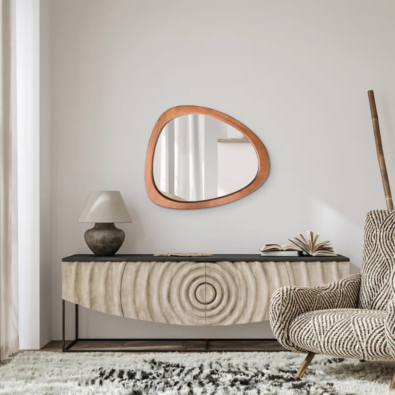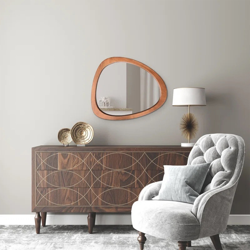 آینه دکوراتیو مدل اطلس، با ترکیب سبک طراحی مینیمال و کلاسیک، یک محصول چوبی باکیفیت است که جلوهای منحصر به فرد به فضای داخلی میبخشد. فرم آینه بیضی است.